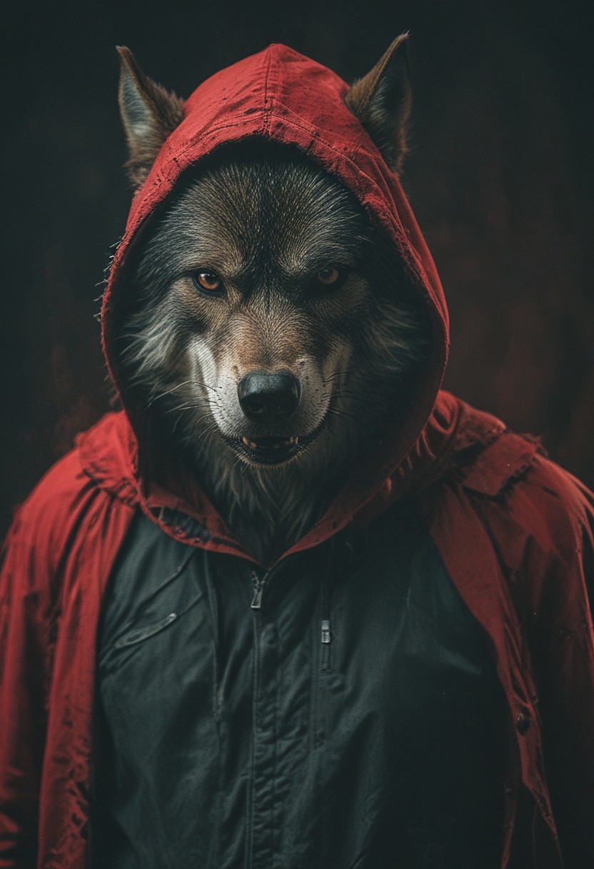 a mad wolf beast in red hood clothing, studio background, high-contrast palette, subtle grain, cinematic quality, modern art photograph