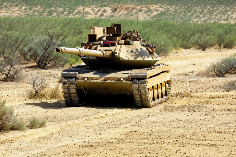 tank, 1tank. (desert background), sand, full view, red lights., city street. close view, 3/4 side view