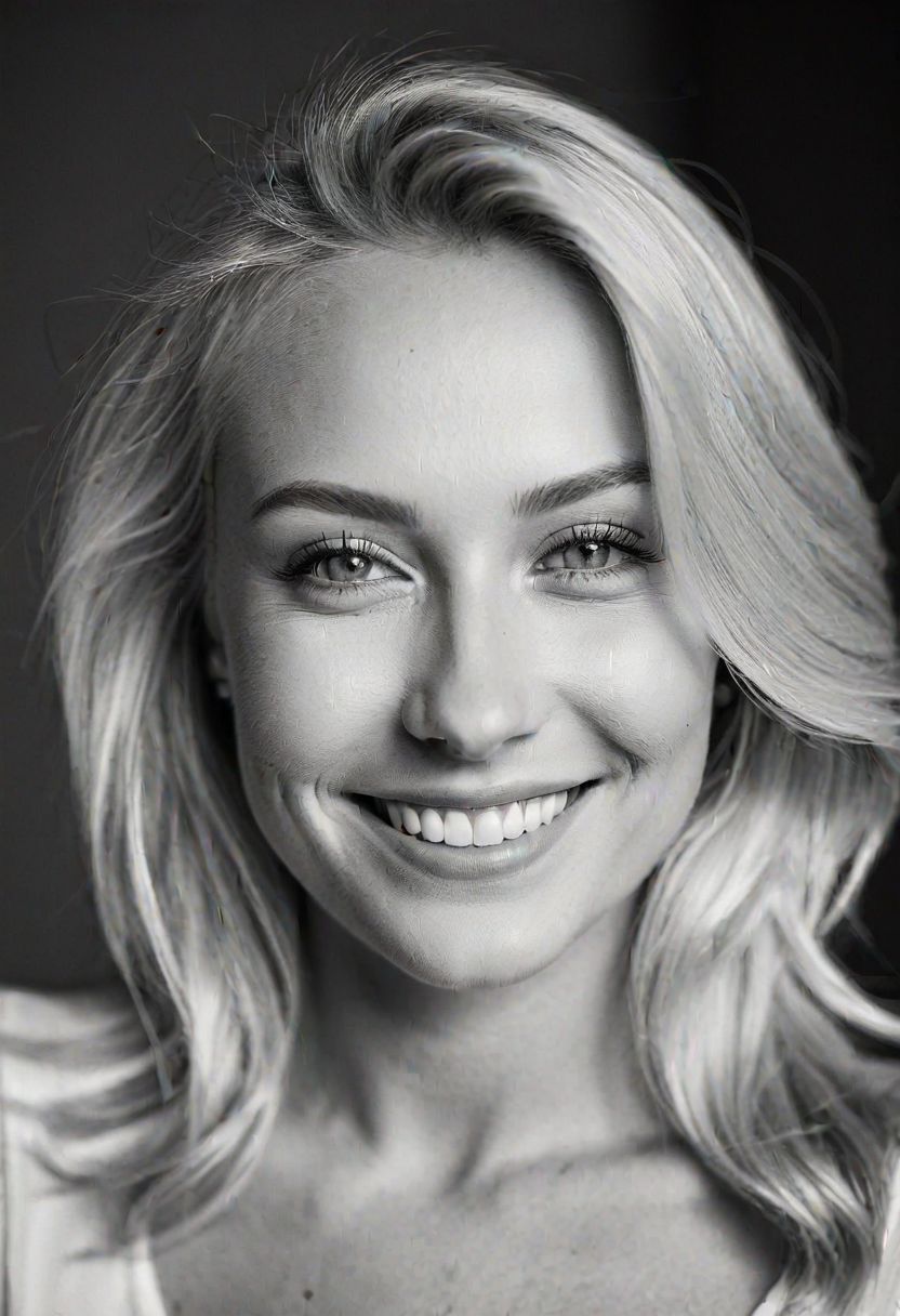 b&w, instagram photo, portrait photo of 22 y.o blonde woman, perfect detailed eyes, natural skin, hard shadows, film grain, smile