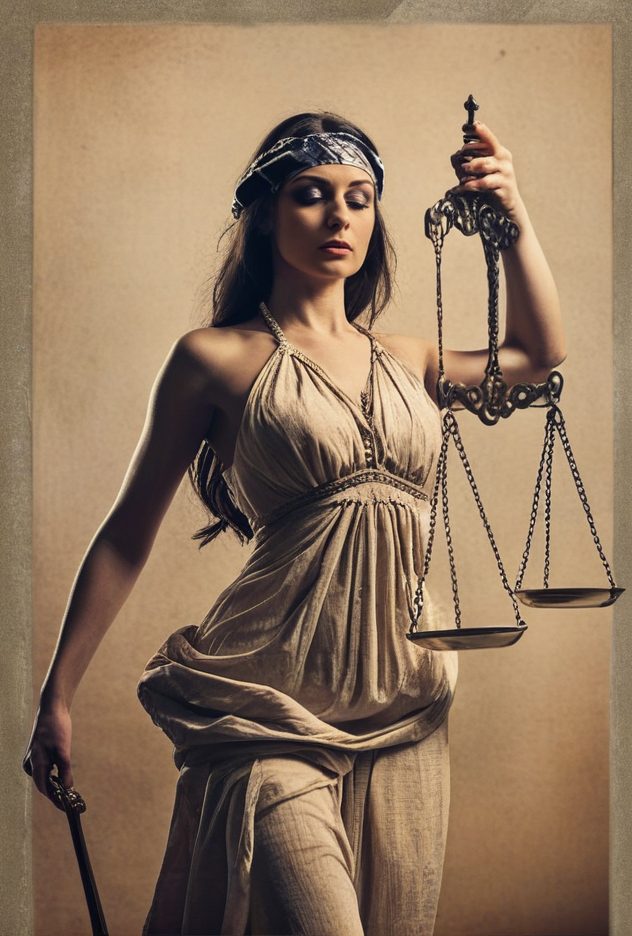 metaphysical style Analog photo (patrotic lady Justice with blindfold covering only one eye, holding unbalanced scales in her hand)BREAK(United STATES Constitutional empire collapsing setting and sunset) <lora:LCM-LoRA-XL_V1:0.21> <lora:SDXLHighDetail_v5:0.3> <lora:sdxl_photorealistic_slider_v1:1.2> . surreal, eerie, uncanny, detailed
