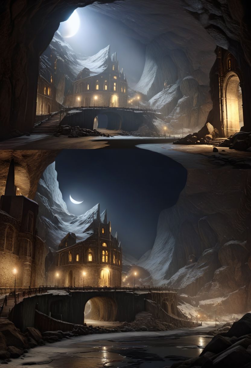 <lora:JJsUnderGroundBuilding_XL:1>, ((UnderGround Building)), ((masterpiece)), ((best quality)), scenery, real world location, realistic, dramatic lighting, high detailed, center composition, ,scenery, dramatic lighting, best quality, hyper detailed, ultra detailed, ultra high definition, 8k, super sharp focus, golden ratio, great detail of textures, night,sky, building, indoor lighting,road,ice, river, mountain, bridge, moon, blizzard, torch, snow,