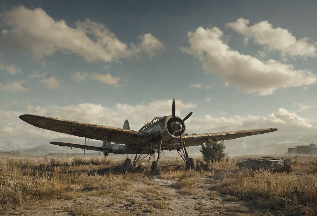 old plane, stunning background, many details, extreme detailed, full of details, Wide range of colors., Dramatic,Dynamic,Cinematic,Sharp details Insane quality. Insane resolution. Insane details. Masterpiece. 32k resolution.