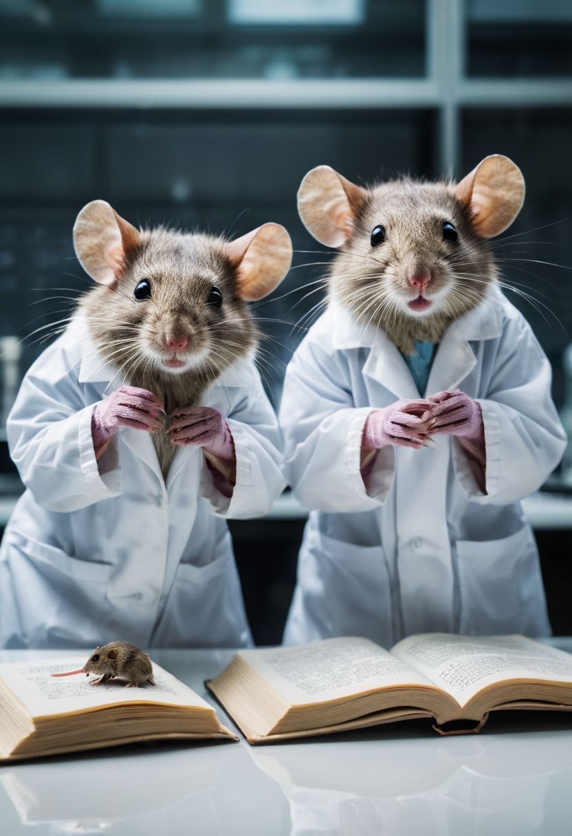 Professional photo of a couple of mice studying deadly virus, Realistic, laboratory, ominous, cinematic, whiskers, doomsday, end of the world, viral outbreak, lab coats, hazmat suits