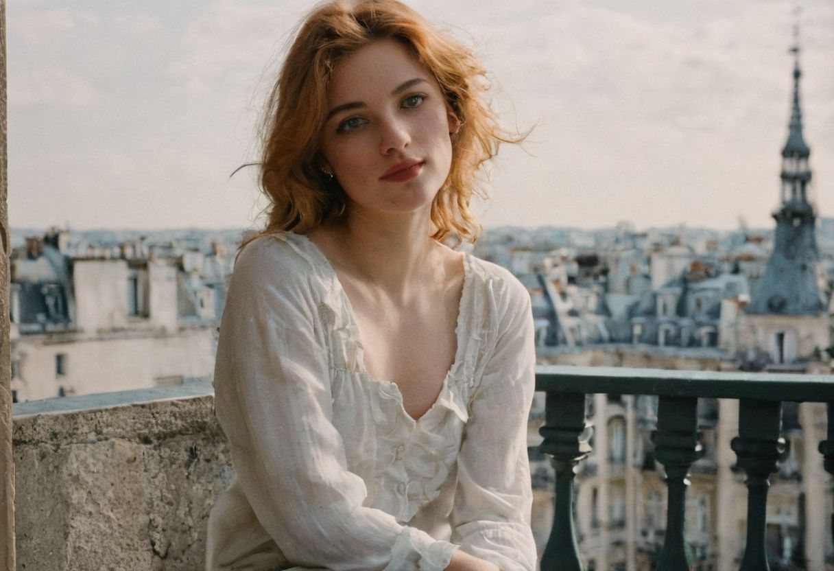 leica m3, 35mm Voigtlander lens, Portra 160/400, photograph of a beauty on a Paris balcony in 1900s, low resolution, high contrast, clear face, natural sunlight