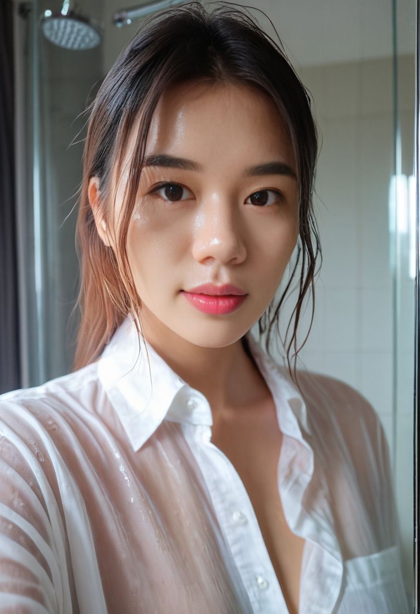 NSFW, Mirror selfie , slight smile , detailed skin face and eyes , showering, natural lighting , at home , see through loose wet shirt, cleavage, natural face, sexy, nipples visible under shirt, water,1girl,