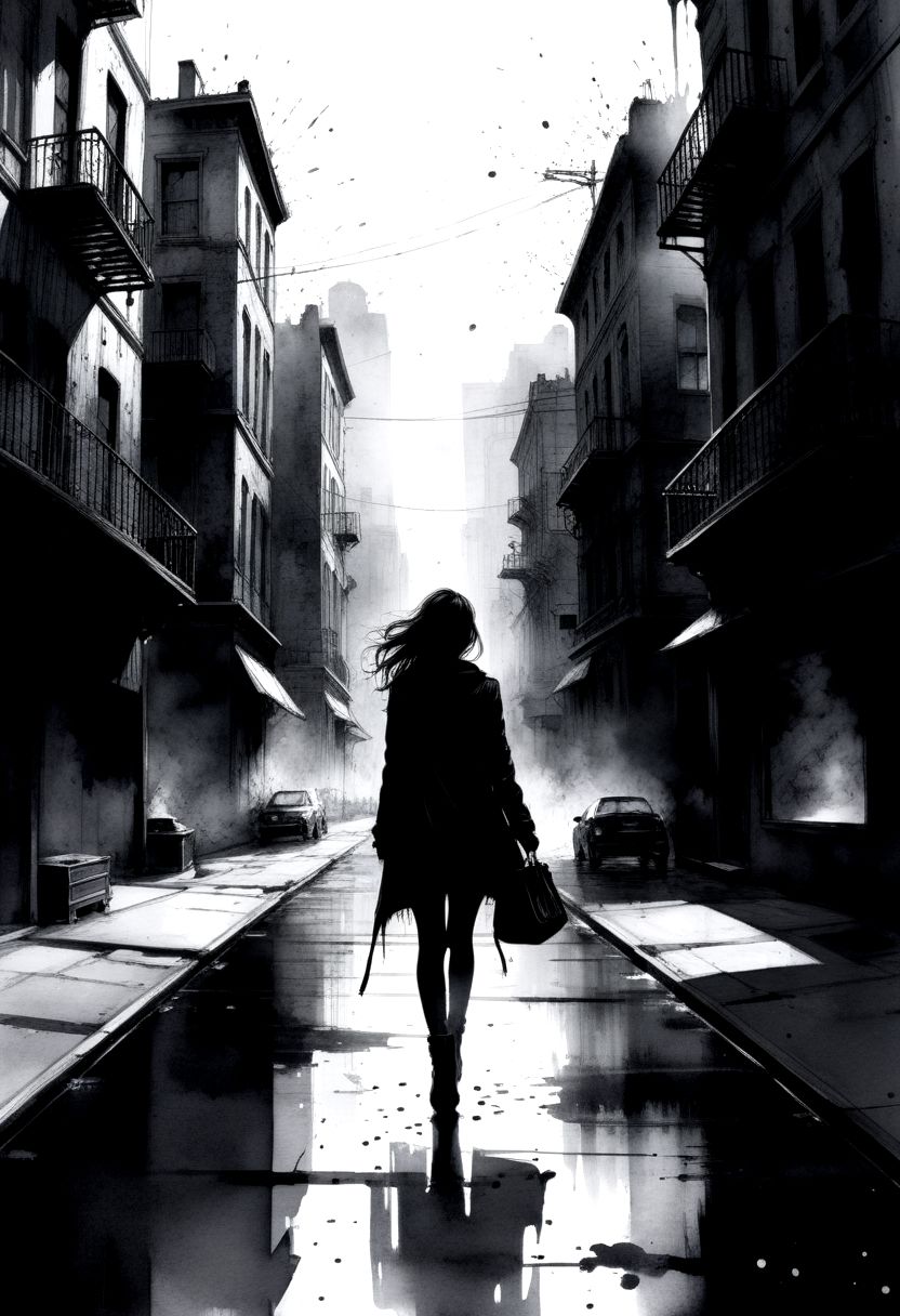 score_9, score_8_up, score_7_up, (best quality, highres:1.1), masterpiece, best quality, high quality, highres, high detailed, masterpiece, high detailed, masterpieceink illustration, hauntingly beautiful scene of a woman walking through an empty city, ink splashes, rough ink sketch