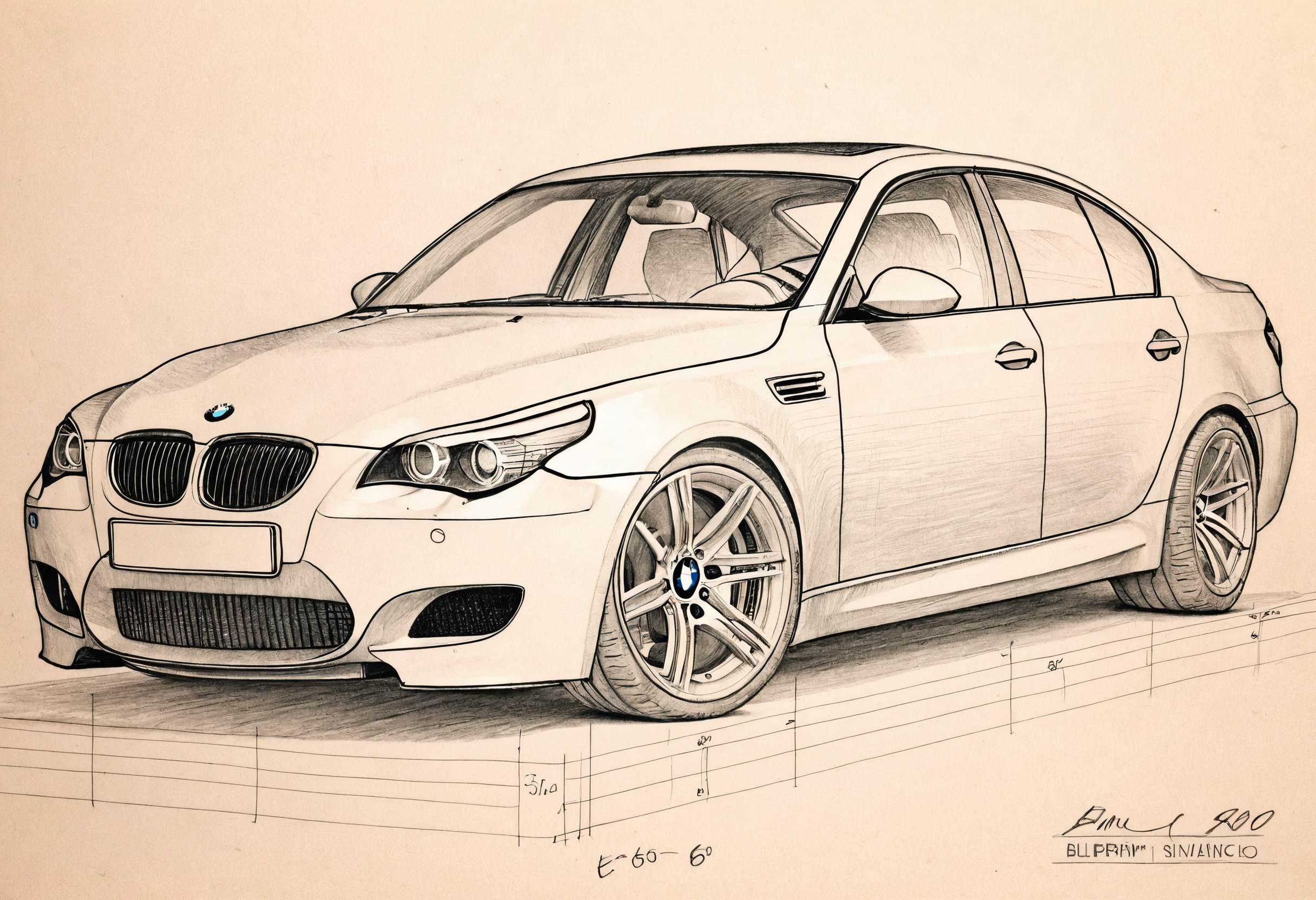 hand-drawn pencil sketch, blueprint of a BMW E60 M5.