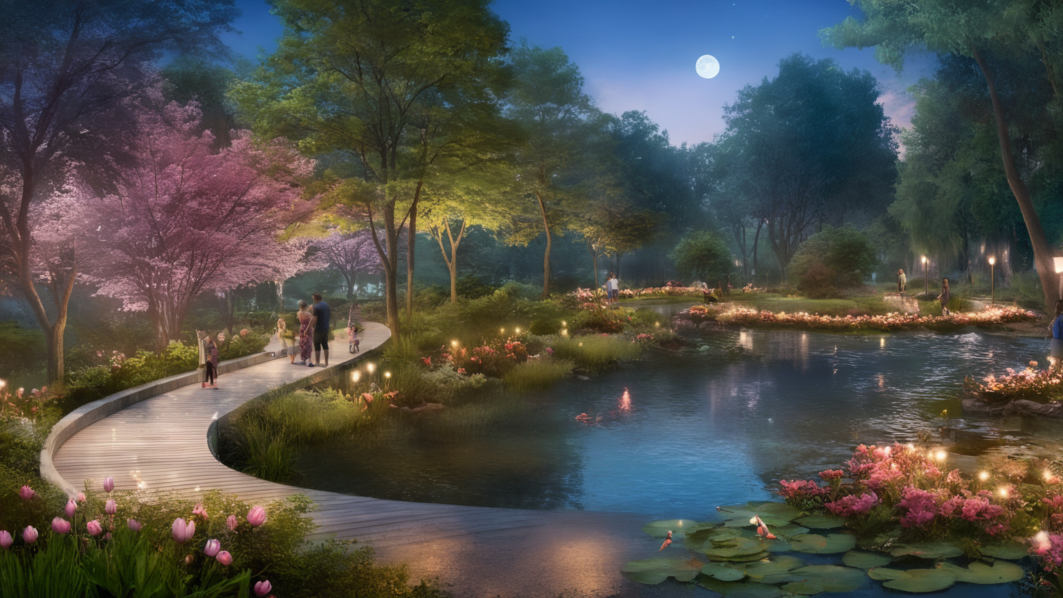 <lora:JJsLandscape_Render_XL:1>, ((Landscape Render)), masterpiece, best quality, scenery, outdoors, tree, sakura tree,real world location, grass, bush, walkway ,water, subject, high quality, lamps , road, grass, ((night)) moon, sky, water color, multiple girls, multiple boys, fense, water lily, fishs under water, flowers,fire flys,