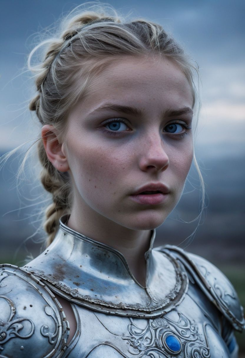Close Up shot of Cinderella as a little warrior, she IS a very young girl, blonde bun hairstyle, beautiful, blue dirt gown, White steel armour, wind, at night, fog, mist, castle at the background, National Geographic photography awarded masterpiece