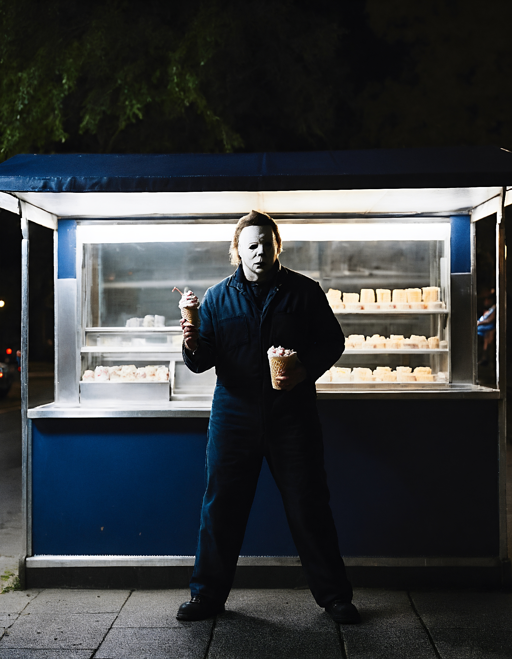 high resolution photo of Michael Myers in a street kiosk serving icecream,gloomy,dimly lit