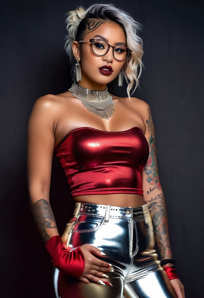 (RAW photo, subject, 8k uhd, dslr, soft lighting, high quality, film grain, Fujifilm XT3, masterpiece, best quality, extremely detailed photograph, volumatic light, ray tracing, bust shot , extremely detailed 8k wallpaper, nsfw), abstract fashion portrait of (3 girls:1.8), ((a 24yo african or south american girl and a 19yo german OR KOREAN girl)) , (black or brown or white skin), (long or medium lenght straight wavey black or brunette or blonde hair), (silver and golden and dark red streaks:1.8), chin bangs, dread hairstyle, braid hairstyle, braid on one side, ponytail, delicate face and eyes, (big:1.8) breast, perky tits, small waist, hourglass figure, (glasses:1.4), (tattoos:1.8), (piercings:1.8),(nose piercing:1.8), (many piercings in ear:1.8), (glitter bodypaint on shoulder), wearing (tight and skinny sexy colorful metallic crop top), (long golden satin gloves) and (golden short skinny pants, sexy pose, in photo studio, dark walls, spot light, smile, hdr