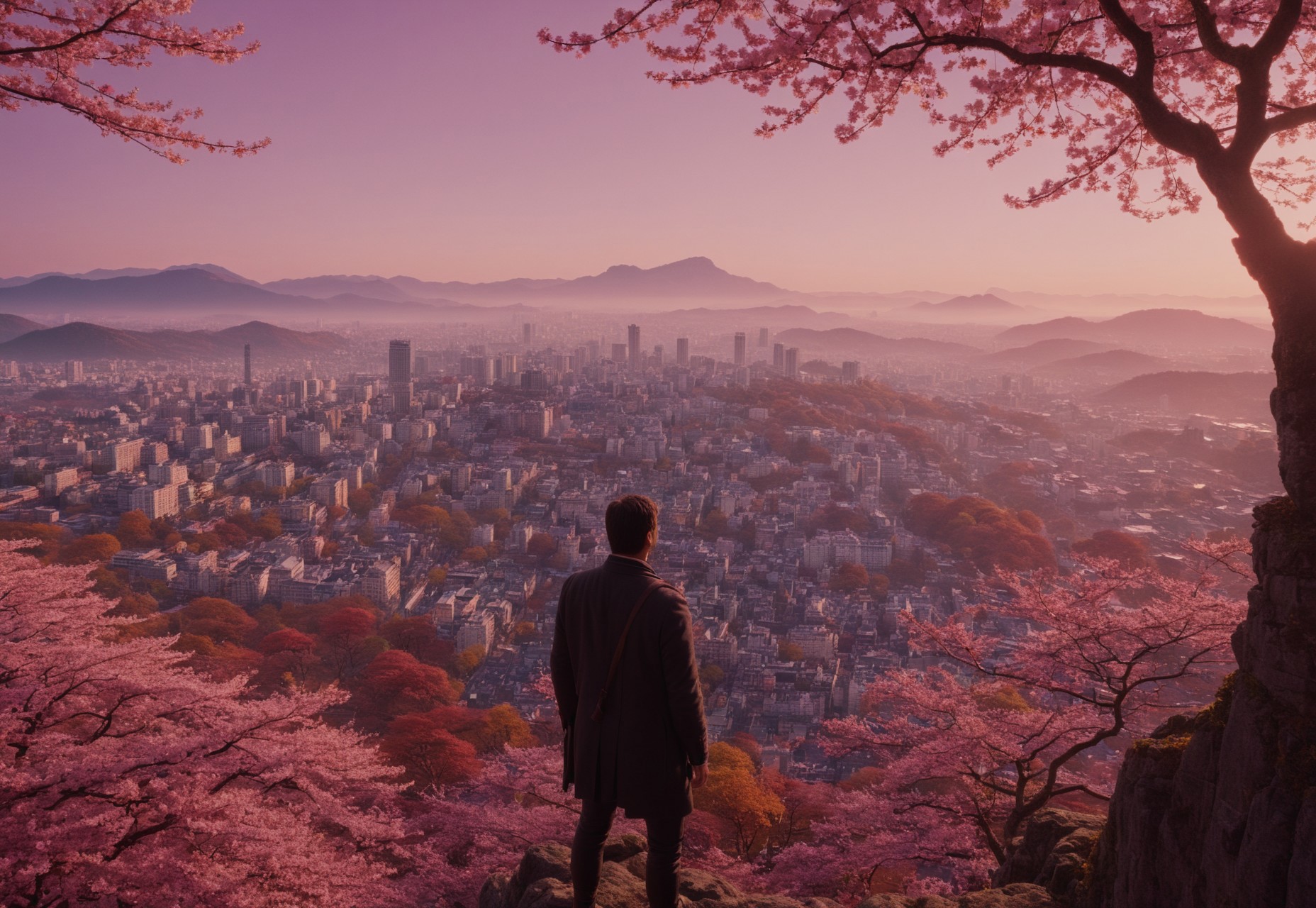 score_9, score_8_up, score_7_up, vibrant, ultra realistic, Movie Still, Cinematic Shot, Cinematic Lighting, Cinematic, extremely detailed city, detailed, high resolution, 4k, dawn, autumn, fantasy city, giant monument in the distance, a man observes the city atop a cliff, sakura trees, vibrant hues, view from above,