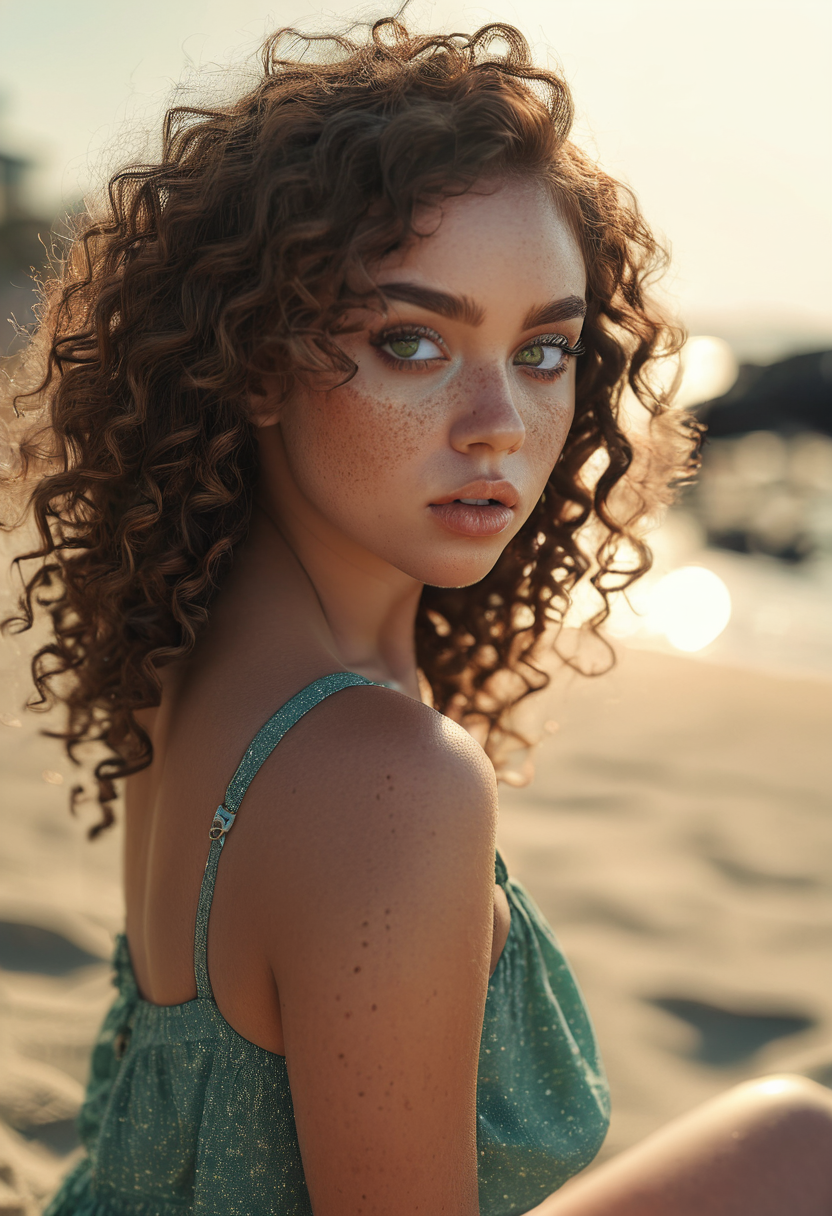 (sharp focus:1.2), photo, attractive mixed woman, (beautiful face:1.1), detailed eyes, luscious lips, (cat eye makeup:0.85), (large eyes:1.0), (toned body:1.2), (curly hair:1.2), wearing (sundress:1.2) sitting on a (beach:1.2). (moody lighting:1.2), depth of field, bokeh, 4K, HDR. by (James C. Christensen:1.2|Jeremy Lipking:1.1), body freckles, green eyes, freckles, beauty marks, sandy skin, sand on skin