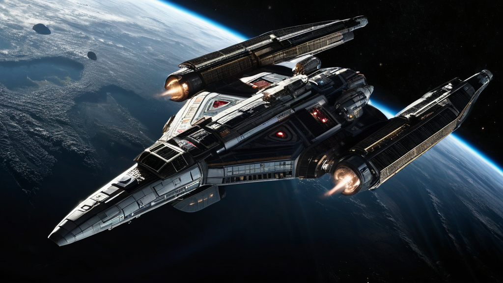epic space ship, moving away, engine thrusters firing, leaving orbit, asteroid belt, highly detailed spacecraft, battlestar galactica