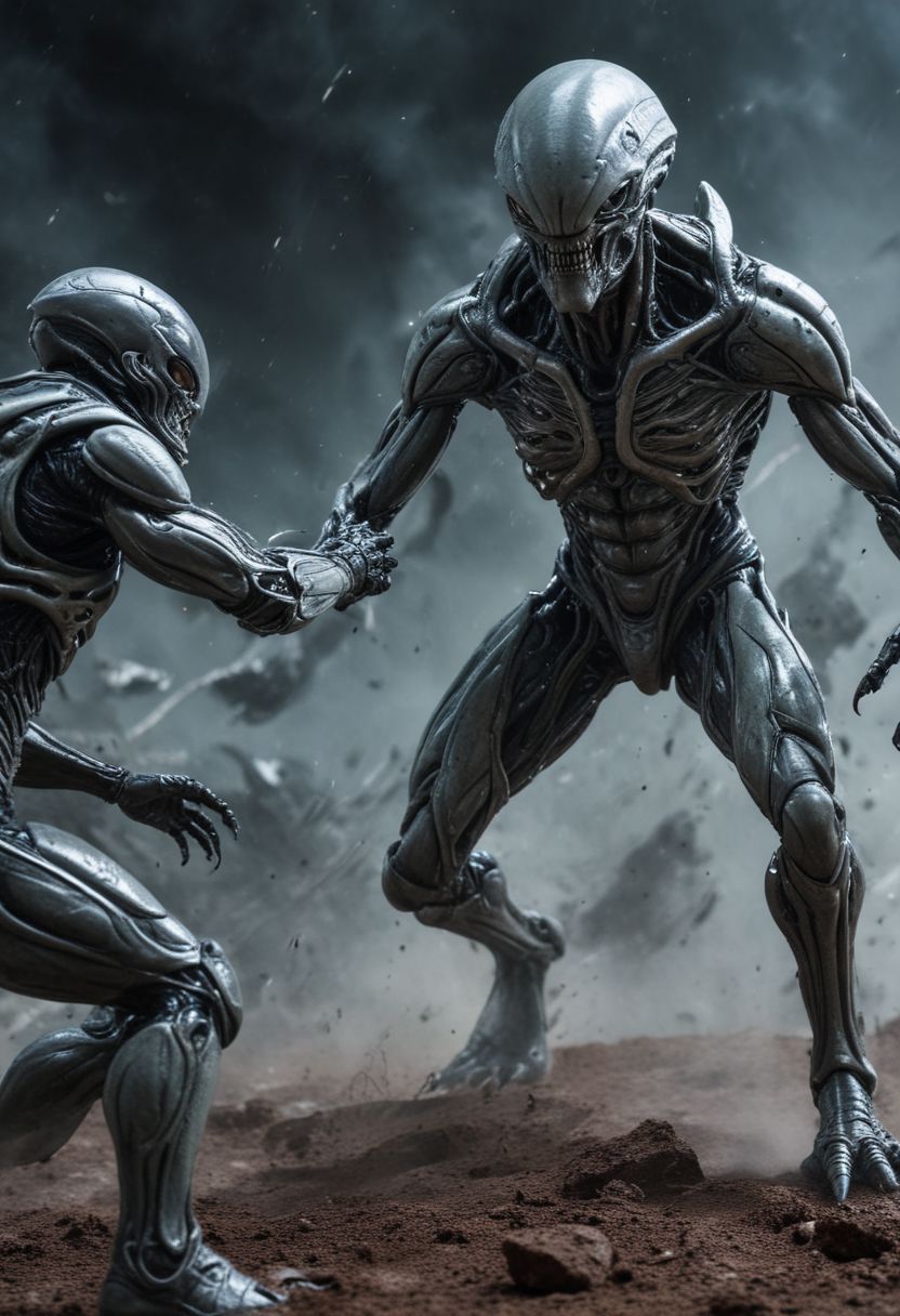 Alien, science fiction, realistic, professional, photography, fighting a grey, massive battle, action shot, physical battle with clear injuries