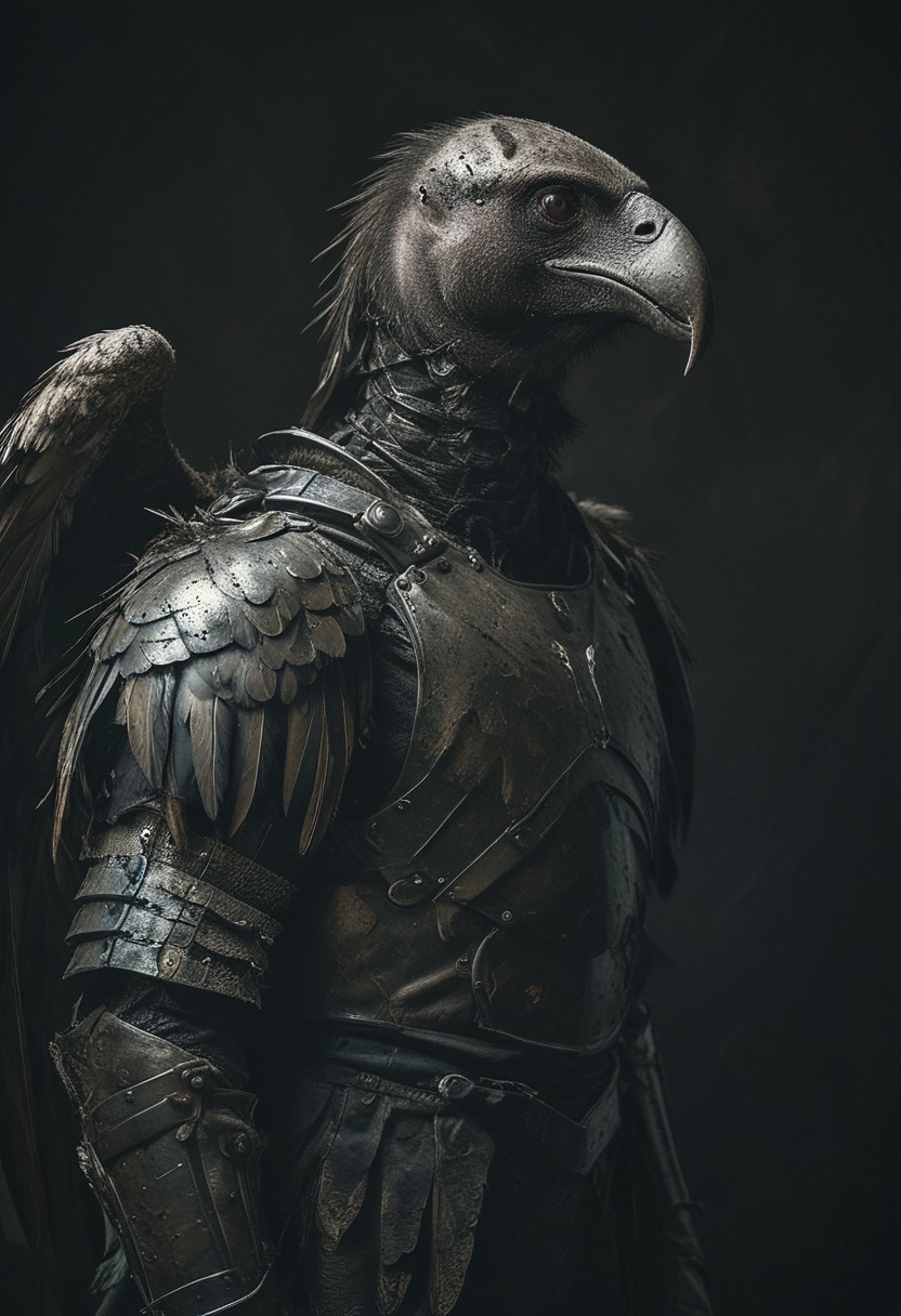a vulture-man in iron armour, black wings, studio background, high-contrast palette, subtle grain, cinematic quality, modern art photograph, looking at viewer