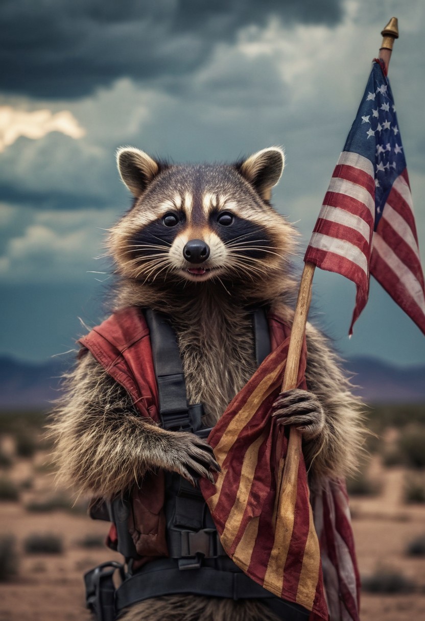 Colorful graded glamour portrait photo of a racoon. Pillar of flames, cute Racoon in tactical gear Holding usa flag. Holding flag. USA bandana. Racoon wearing Sunglasses. Star and stripes. infront of a colorful nuclear blast. Epic lightning.epic nuclear explosions in the background. Break Absurdres, 8K, UHD, many details, extreme detailed, full of details, Wide range of colors, HDR. desert storm backdrop. throwing a translucent red/tanslucent purple/black, atmospheric haze, Film grain, cinematic film still, shallow depth of field, highly detailed, high budget, cinemascope, moody, epic, OverallDetail, gorgeous, RAW photo, photorealistic, candid camera, color graded cinematic, eye catchlights, atmospheric lighting, skin pores, imperfections, natural, shallow dof,