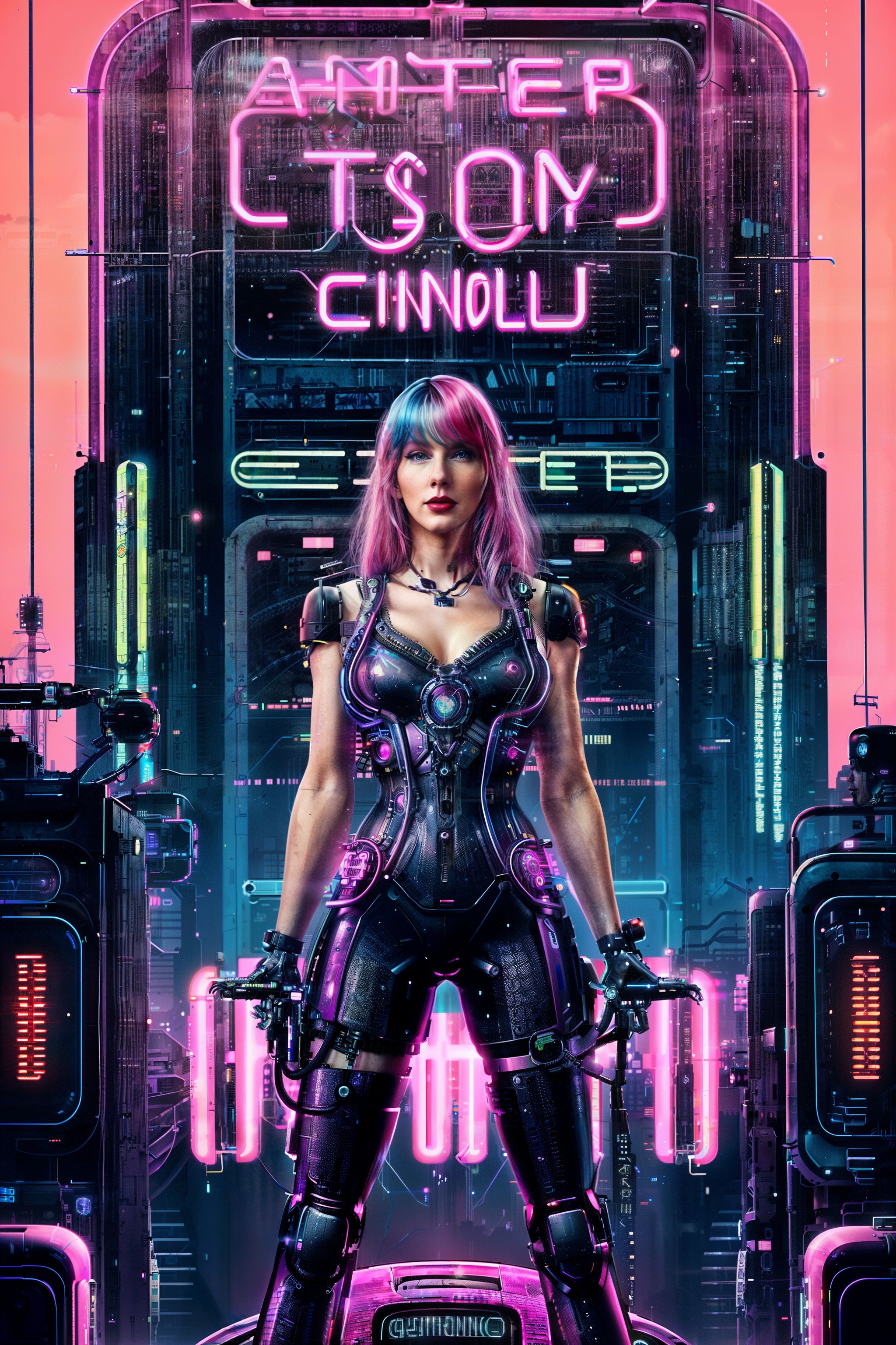 <lora:Taysway_V5-10:0.75> Taysway, adult woman, long neon pink hair, cinematic, 80s movie poster themed, 80s poster style, (mechanical:1.3), mind blowing, trippy, retro artwork, (cyberpunk theme:1.3), dystopian