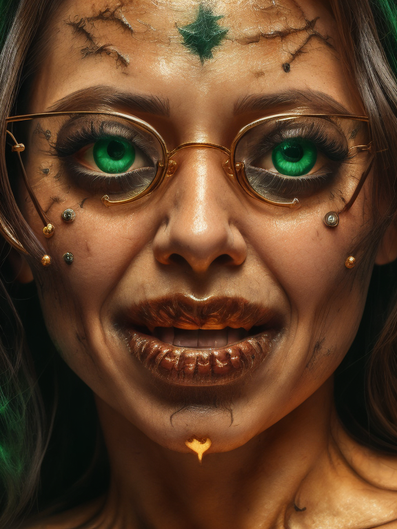 extreme (closeup:1.6) RAW photography, Pure golden eye beautiful Face of mythical (half angel:0.2799999999999999) (half devil:0.8200000000000001) lady (upclose:1.6) spooky and supernatural green patches on face with awesome (halloweentechto glasses) <lora:halloweenTech:1.12>, (scream:0.8200000000000001), (trick:0.8200000000000001), (ugly:0.8200000000000001), (abomination:0.8), (horror:0.8200000000000001), (teeth:0.8200000000000001), (smile:0.19999999999999996), (treat:0.19999999999999996), (cleavage:0.3599999999999999)