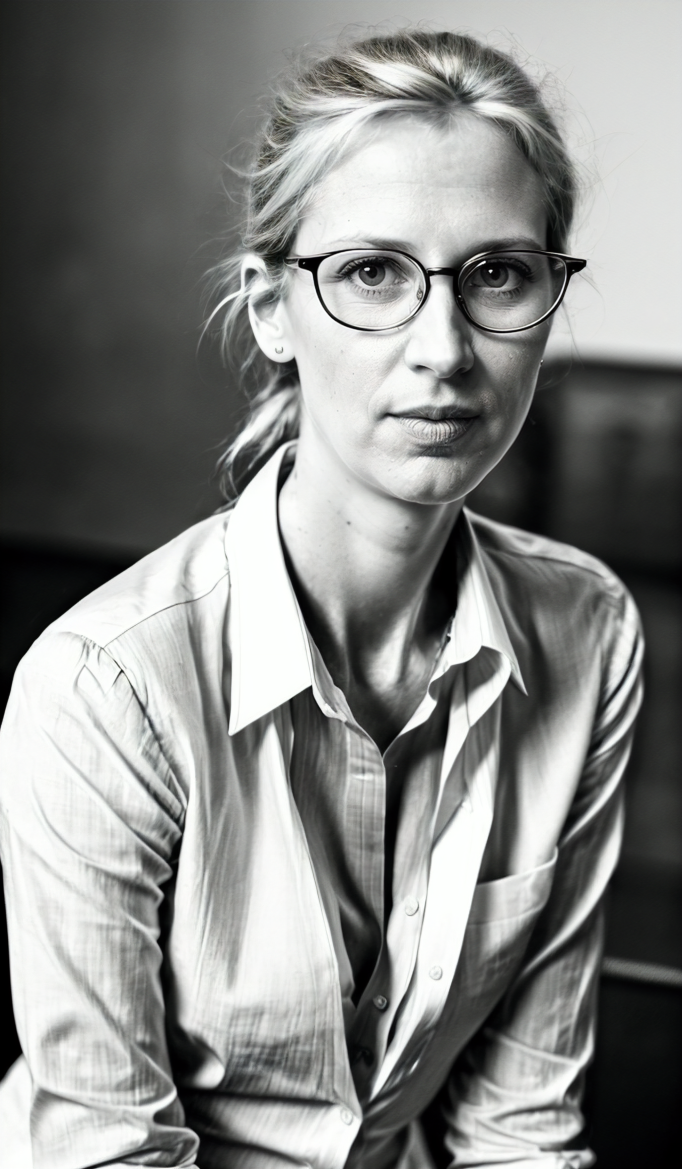 Alice_Weidel, picture of a 44 y.o. woman, ((wears round glasses)), wears a hair bun, blond hair,wear closed white blouse <lora:add_detail:0.1>