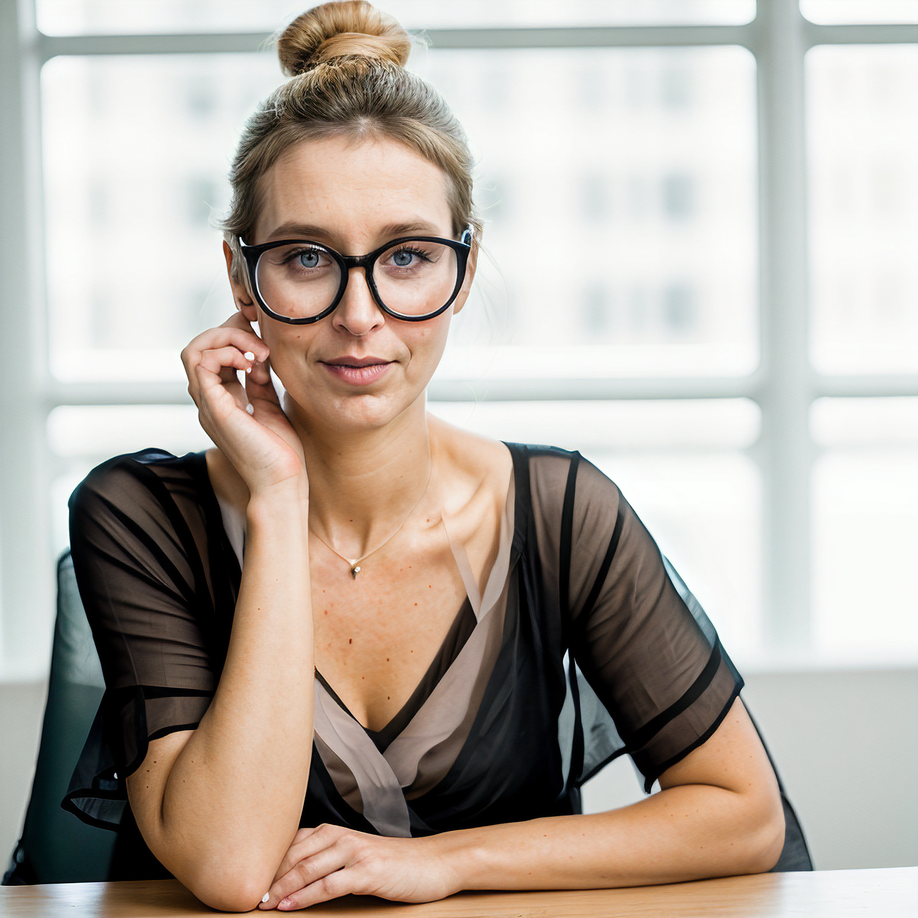 Alice_Weidel, 44 years old woman, blue eyes, wears round glasses, ((wears a bun)) ,long blond hair, (detailed hair:1.4),((wearing a black sexy closed blouse)), RAW photo, subject, 8k uhd, dslr, soft lighting, high quality, film grain, Fujifilm XT3 <lora:add_detail:0.1>