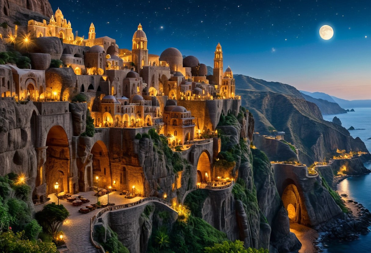 A grand, mysterios fantasy city carved into rocks side with intricate architectural designs. The city features multiple domed buildings, towers and statues, and a large bridge connecting different parts of the city. The scene is set in a lush landscape with rocky cliffs, creating a sense of awe and wonder. The mysterios night down on the city. A lot of window have small mysterios lihgts. On sky shine moon and stars shower.
