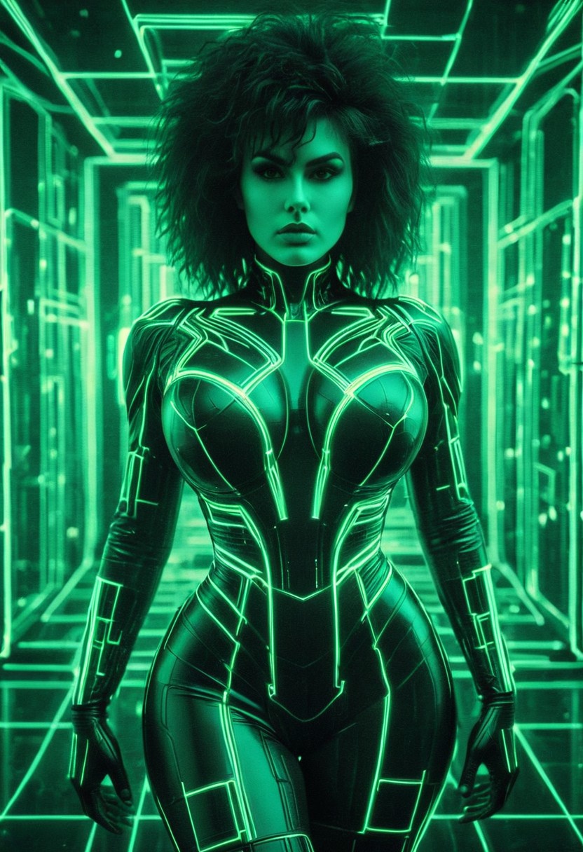 headshot of a proud young intimidating chubby 1980s porn_star, chin up, fabulous big hair, perm, large breasts big boobs, pouting, in an avant-garde designer (yellow:0.3) latex troncore bodysuit, futuristic fashion, wide hips, long sleeves, eye contact, slit skirt, posing in a bright scifi hexagonal cyberpunk (green grid:0.2), mad-cyberspace (Professional photography, bokeh, flash photography, sharp focus, tilt-shift lens, wide angle shot:0.9)