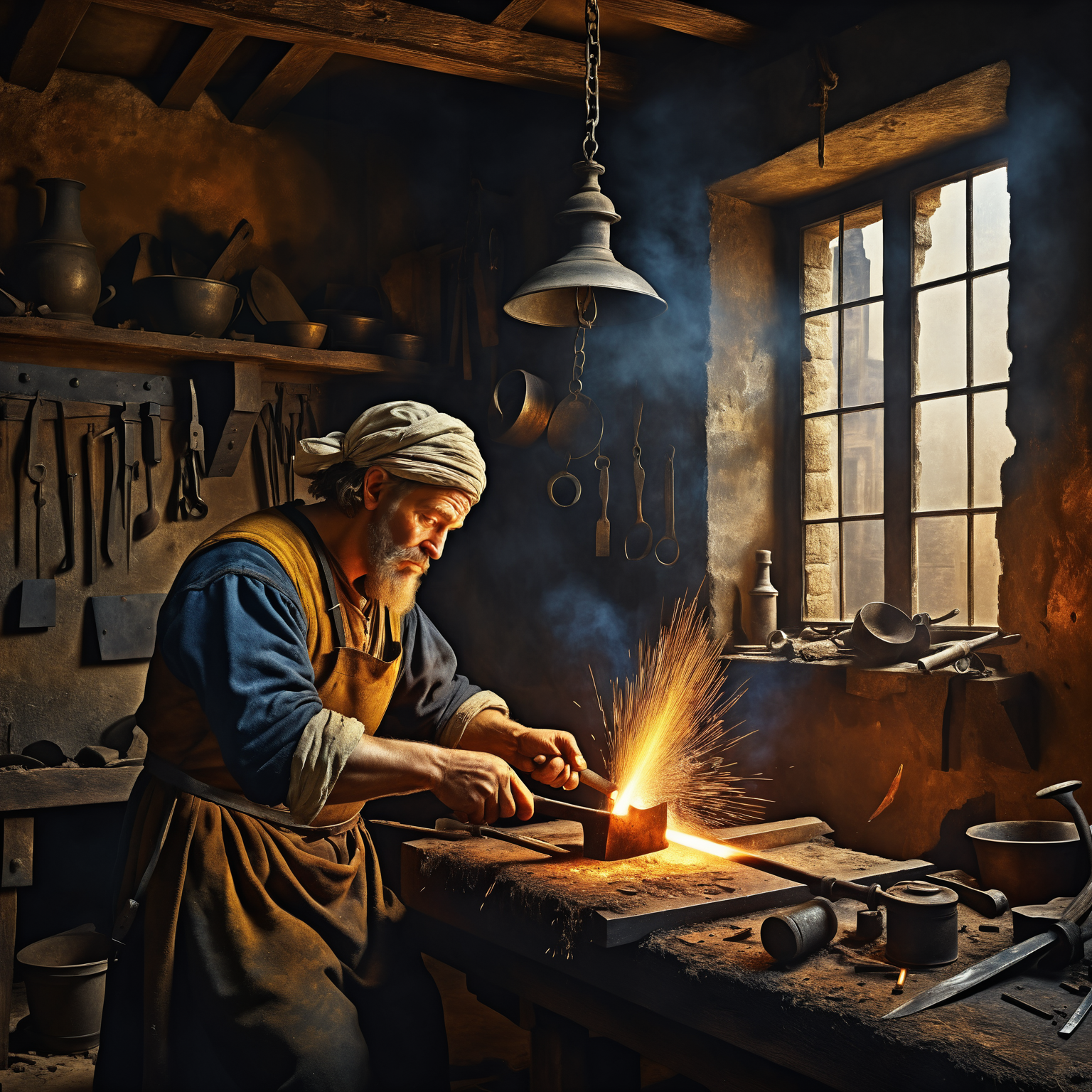 mysterious blacksmith in a baroque painting style, inspired by Jan Vermeer and Rembrandt van Rijn, historical art, oil painting, cinematic volumetric lighting, amazing details <lora:add-detail-xl:1>