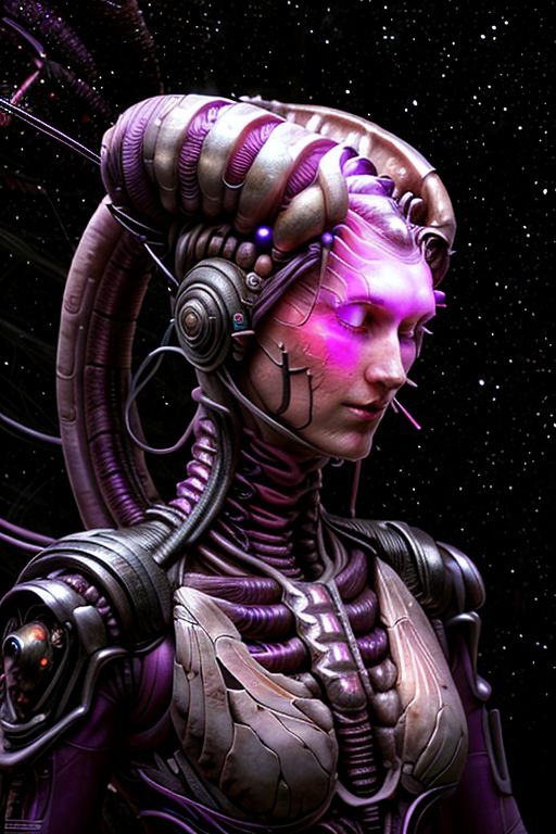 portrait of pearl Caterpillar female person (long neck, slender arms)) massive headdress, bio armour, (luminesce purple hues glowing) floating particles, insect textures, scifi,