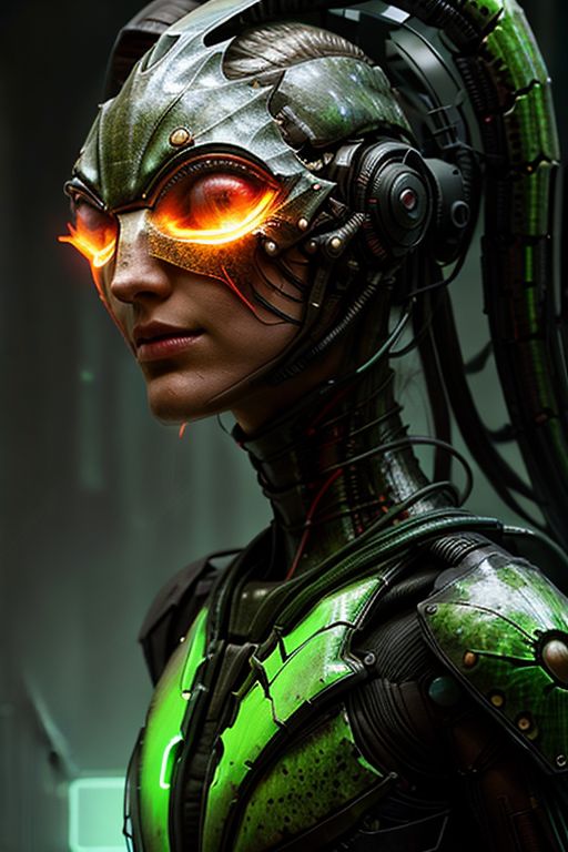 portrait of dark crab female person (long neck, slender arms)) massive headdress, bio armor, (luminescen green glowing) floating particles, insect textures, scifi