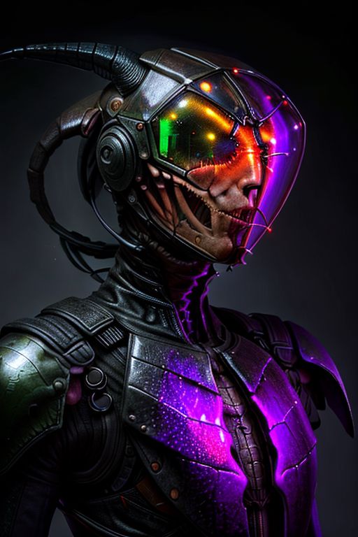 portrait of (beautiful face, long neck, slender arms)) bulletproof vest, helmet with horns, Mantis, greater stag beetle, crab, (purple glowing), detailed background, floating particles, darkness,