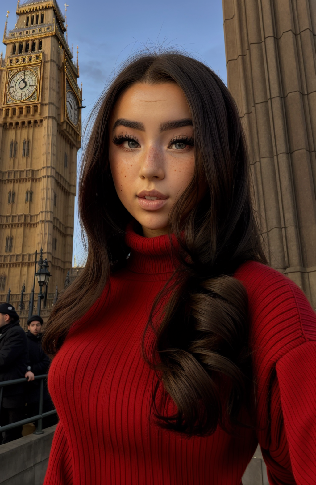ueblJessie Lefteri, jessielefteri, masterpiece, best quality, 1girl, waist up, eyes, freckles, smile, lips, black hair, thick eyebrows, closed mouth, looking at viewer, wide hips, wearing a red sweater, turtleneck, medium shot of a woman standing in front of london's big ben,, detailed sharp, flash photo solo, <lora:Jessie Lefteri-000008:1>