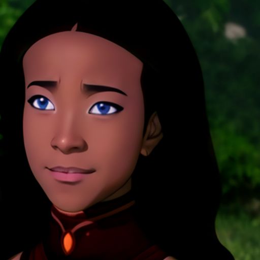 katara, catoon_style, 1girl, solo, long_hair, looking_at_viewer, smile, blue_eyes, brown_hair, black_hair, bare_shoulders, closed_mouth, upper_body, choker, day, nature, dark_skin, collar, dark-skinned_female, parody, own_hands_together, armband, close-up, armlet, style_parody, own_hands_clasped, official_style, anime_coloring