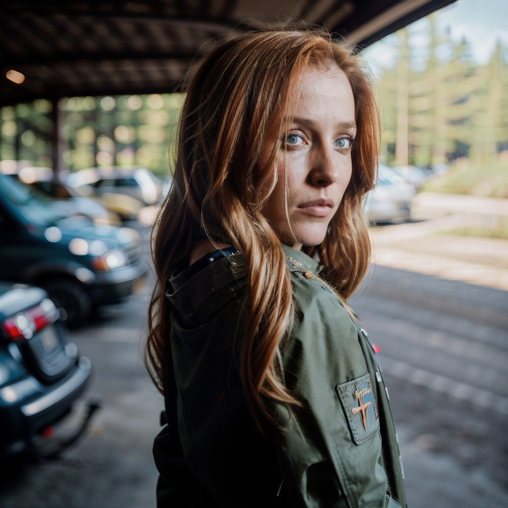 RAW photo, photo of a young, attractive, actress, sks woman, <lora:gillianAnderson_v1:1.3> with (long sandy blonde hair), (wearing wastelander clothes:1.3), (looking over shoulder in a parking lot:1.3), summer time, sharp focus, wide angle, 8k UHD, DSLR, film grain, Fujifilm XT3, award winning, bokeh