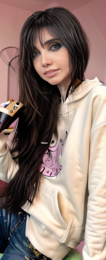 ( skinny :1.2), thin girl, with pastel sweatshirt, with black hair, <lora:EugeniaCooneyV4:1> emo style hair , black hair , drinking a coffee