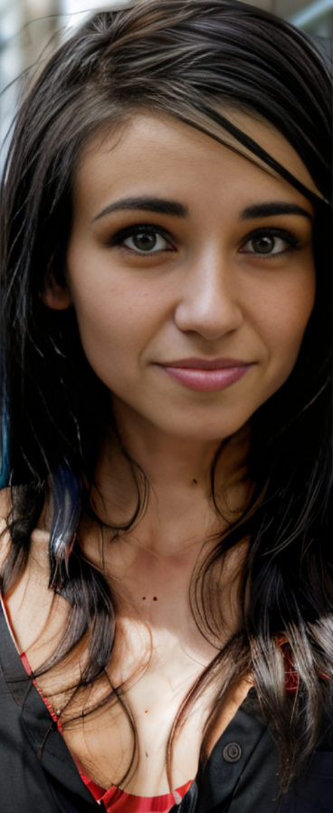 <lora:LightsV2:1> a woman , red and black shirt, black hair. beautiful face