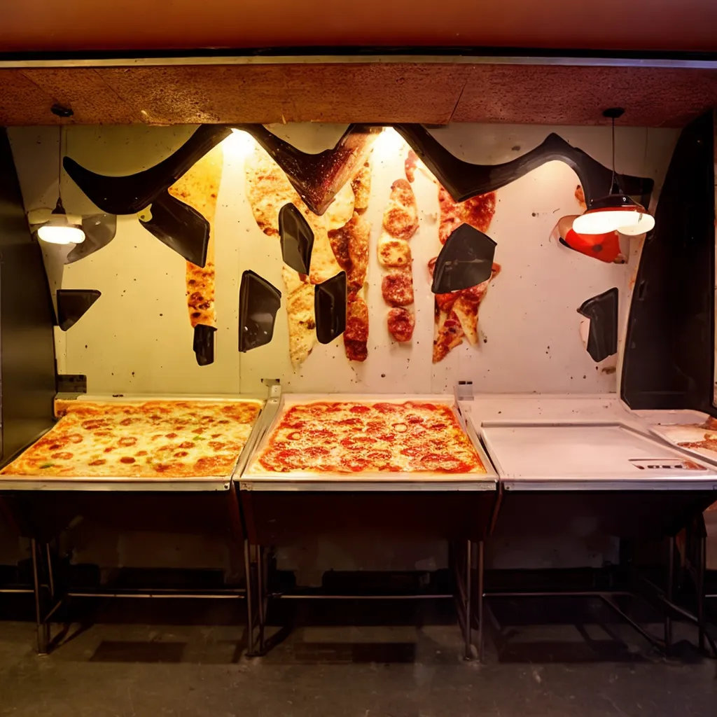 inside of a pizzeria from the 80s, multiple tables. multiple arcade line the walls,