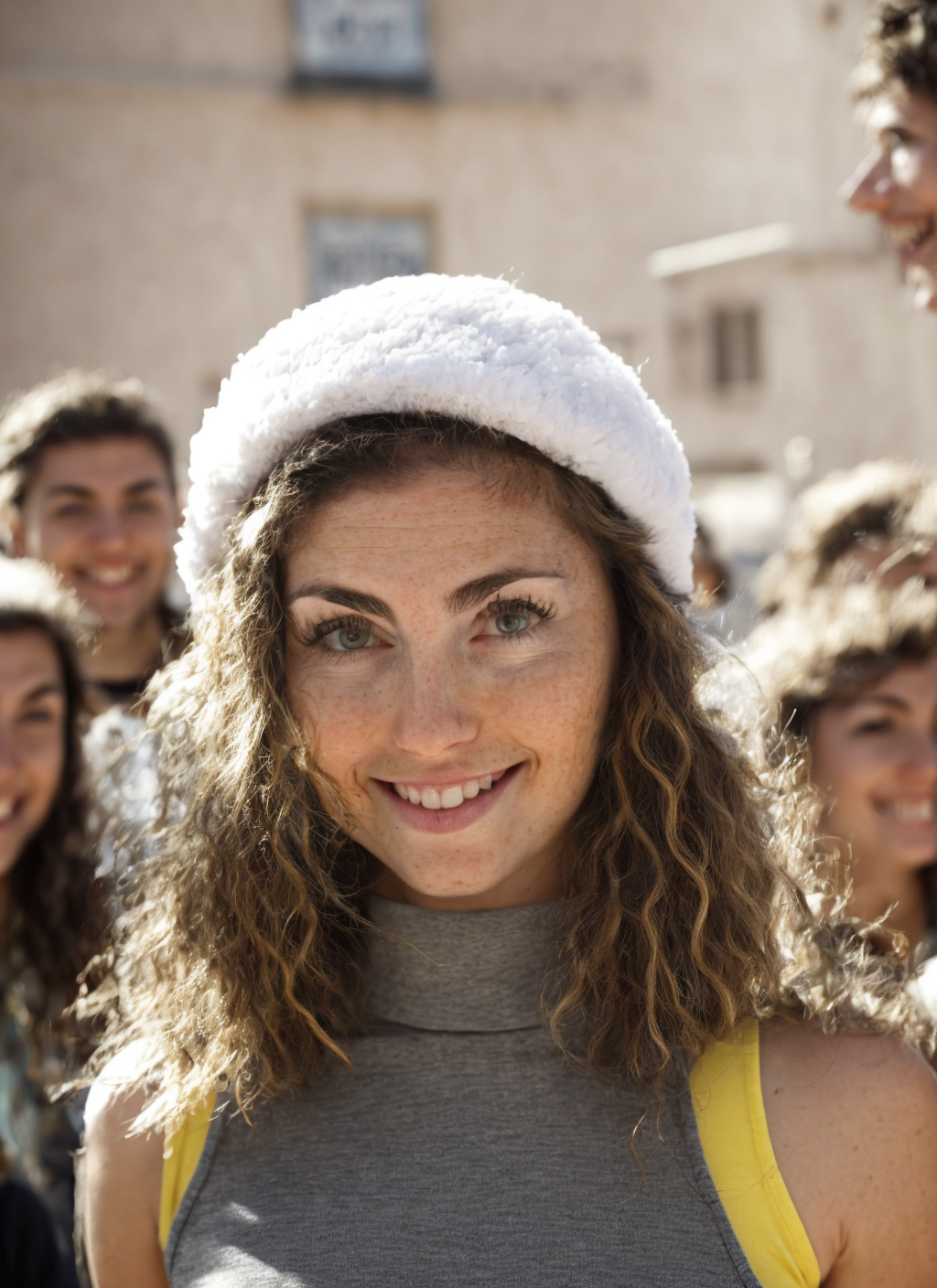 <lora:gillianbarn3s:1> gillianbarn3s, beautiful young woman, smile, perfect teeth, (close up of the face:1.3), (vibrant vivid colors), grey turtleneck dress, looking at the viewer, looking at the camera A captivating carnival-goer is swept up in the jubilant crowd during a lively street parade. Her vibrant feathered samba costume adds to the festive atmosphere as the throng of spectators cheers and jostles for a better view