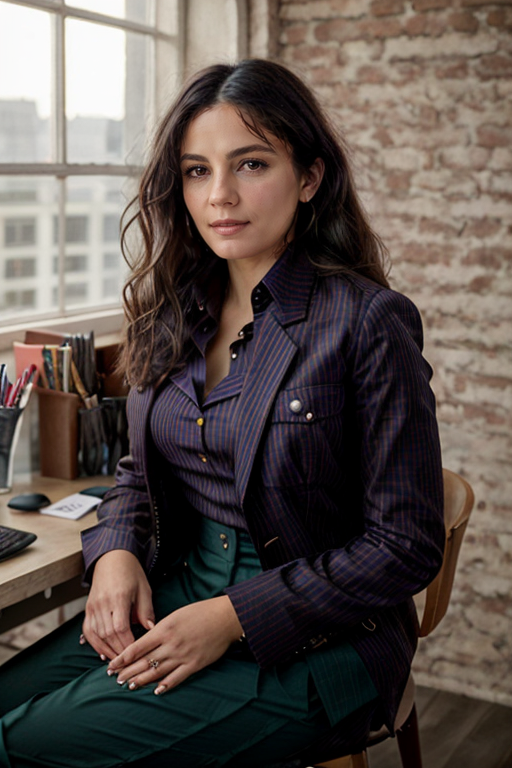 <lora:Monica1873Bar:0.9> a woman, m1873b, solo, wearing blouse, waistcoat,. jacket, trousers, in an office, wavy hair,