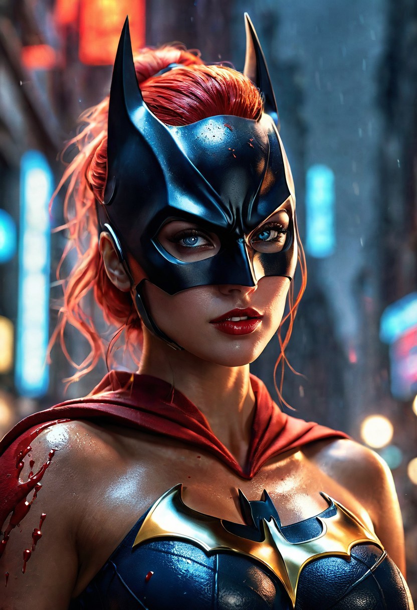 High resolution ultra-realistic of beautiful realistic Batgirl fighting against alien invasion, cinematic style, standing on a bloody and stormy battlefield in a fighting pose, bloody massacre, realistic modern combat costume, black mask, red cape, perfect athletic figure, wavy red hair, handsome dirty bloody face, realistic blue eyes, beautiful perfect detailed pupils, wet oily shiny skin, covered in dirt and blood, beautiful firm Breasts, defiant and seductive, sexy 20 year old girl, 8k resolution concept art portrait by Greg Rutkowski, Dark Gotham City, Artgerm, WLOP, Alphonse Mucha, dynamic lighting, hyperdetailed, intricately detailed, Splash art trending on Artstation triadic colors, Unreal Engine, 5 volumetric lighting, Cinematic Lighting, intricate, smooth, sharp focus digital painting, Asymmetrical Balance, painting, dynamic lighting