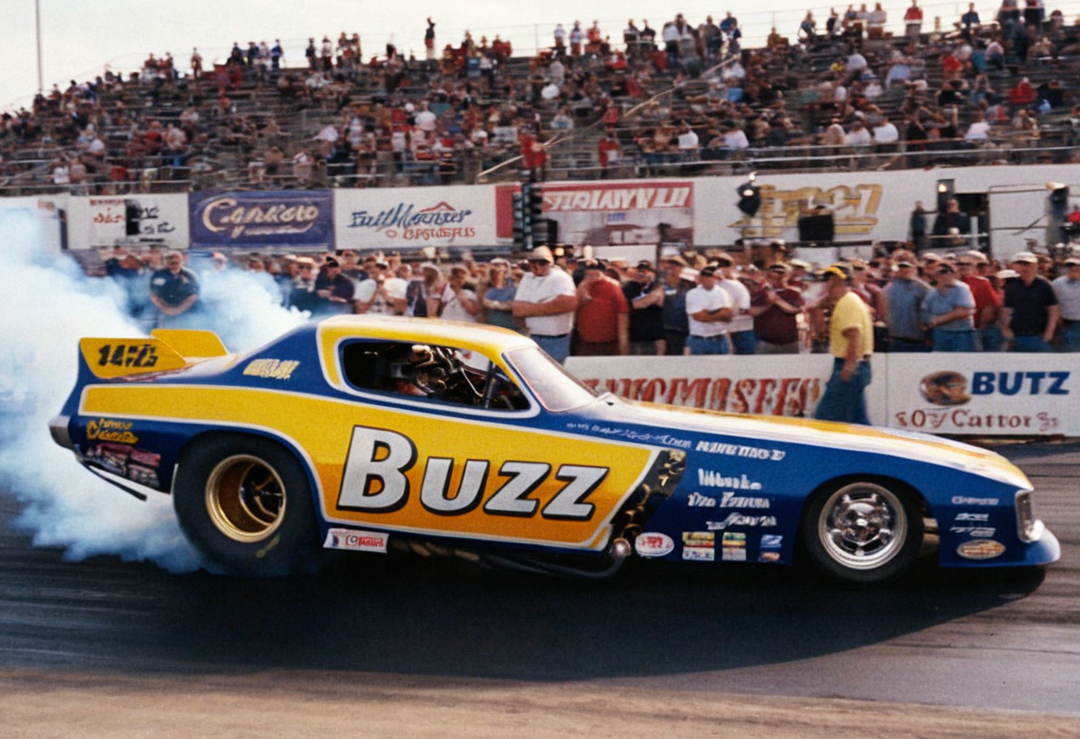 VintageMuscleCar, dragster, side view, race track, smoke trail, people, outdoors, 4K, highly detailed, (stylish grainy analog 35mm film photo, "BUZZ")