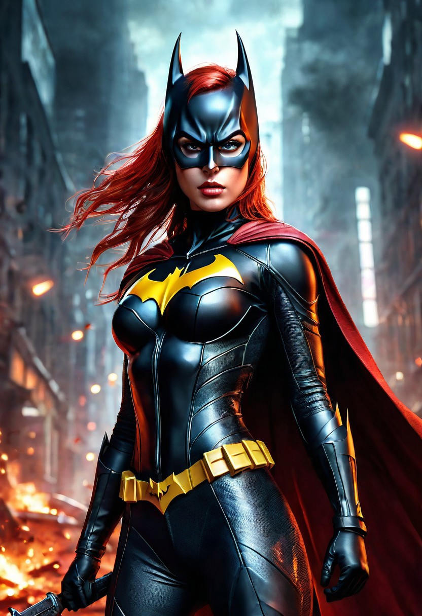 High resolution ultra-realistic of beautiful realistic Batgirl fighting against alien invasion, cinematic style, standing on a bloody and stormy battlefield in a fighting pose, bloody massacre, realistic modern combat costume, black mask, red cape, perfect athletic figure, wavy red hair, handsome dirty bloody face, beautiful perfect detailed pupils, wet oily shiny skin, covered in dirt and blood, beautiful firm Breasts, defiant and seductive, sexy 20 year old girl, 8k resolution concept art portrait by Greg Rutkowski, Dark Gotham City, Artgerm, WLOP, Alphonse Mucha, dynamic lighting, hyperdetailed, intricately detailed, Splash art trending on Artstation triadic colors, Unreal Engine, 5 volumetric lighting, Cinematic Lighting, intricate, smooth, sharp focus digital painting, Asymmetrical Balance, painting, dynamic lighting