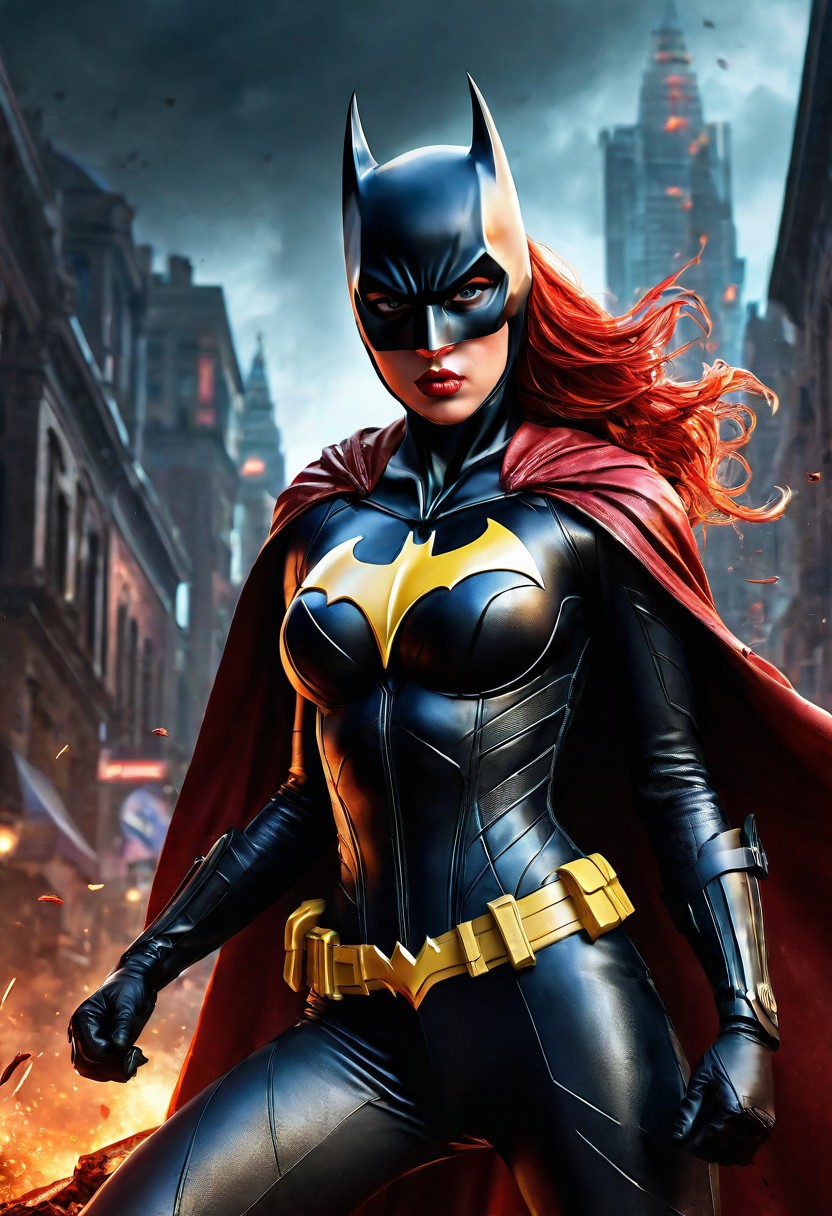 High resolution ultra-realistic of beautiful realistic Batgirl fighting against alien invasion, cinematic style, standing on a bloody and stormy battlefield in a fighting pose, bloody massacre, realistic modern combat costume, black mask, red cape, perfect athletic figure, wavy red hair, handsome dirty bloody face, beautiful perfect detailed pupils, wet oily shiny skin, covered in dirt and blood, beautiful firm Breasts, defiant and seductive, sexy 20 year old girl, 8k resolution concept art portrait by Greg Rutkowski, Dark Gotham City, Artgerm, WLOP, Alphonse Mucha, dynamic lighting, hyperdetailed, intricately detailed, Splash art trending on Artstation triadic colors, Unreal Engine, 5 volumetric lighting, Cinematic Lighting, intricate, smooth, sharp focus digital painting, Asymmetrical Balance, painting, dynamic lighting