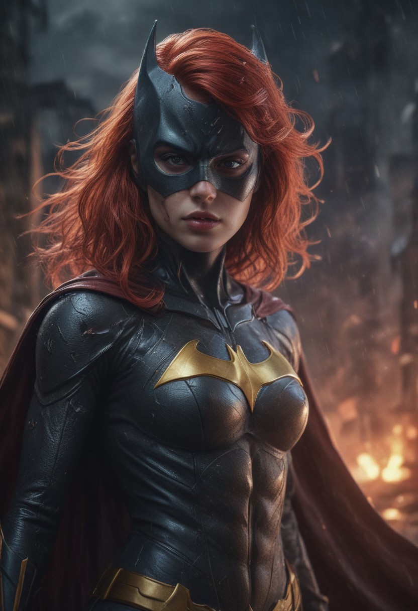 High resolution ultra-realistic of beautiful realistic Batgirl fighting against alien invasion, cinematic style, standing on a bloody and stormy battlefield in a fighting pose, bloody massacre, realistic modern combat costume, black mask, red cape, perfect athletic figure, wavy red hair, handsome dirty bloody face, beautiful perfect detailed pupils, wet oily shiny skin, covered in dirt and blood, beautiful firm Breasts, defiant and seductive, sexy 20 year old girl, 8k resolution concept art portrait by Greg Rutkowski, Dark Gotham City, Artgerm, WLOP, Alphonse Mucha, dynamic lighting, hyperdetailed, intricately detailed, Splash art trending on Artstation triadic colors, Unreal Engine, 5 volumetric lighting, Cinematic Lighting, intricate, smooth, sharp focus digital painting, Asymmetrical Balance, painting, dynamic lighting