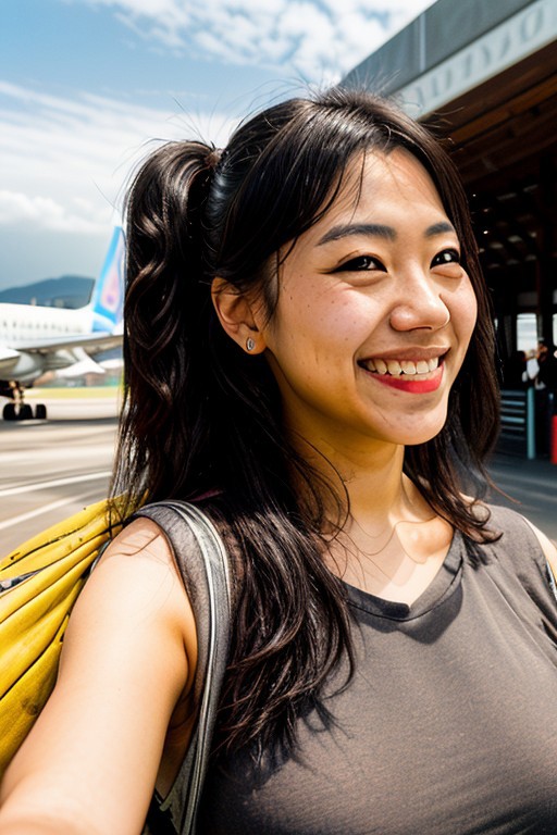 RAW photo, subject, high quality, armoutstretched, pov, personal, intimate, self-portrait photography, asian female, beautiful, long black hair, ponytail, cap, smiling, in front of an airport entrance in Taipei, sunny day, sunlight