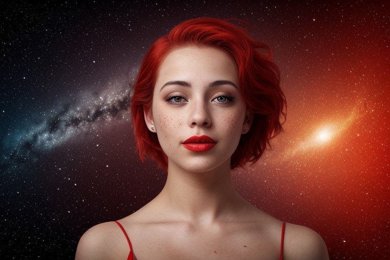 [[[young]]] beautiful woman with red short straight hair and freckles, hourglass figure, teardrop breasts, stary night sky in fantasy setting background, red lipstick, view centered on face