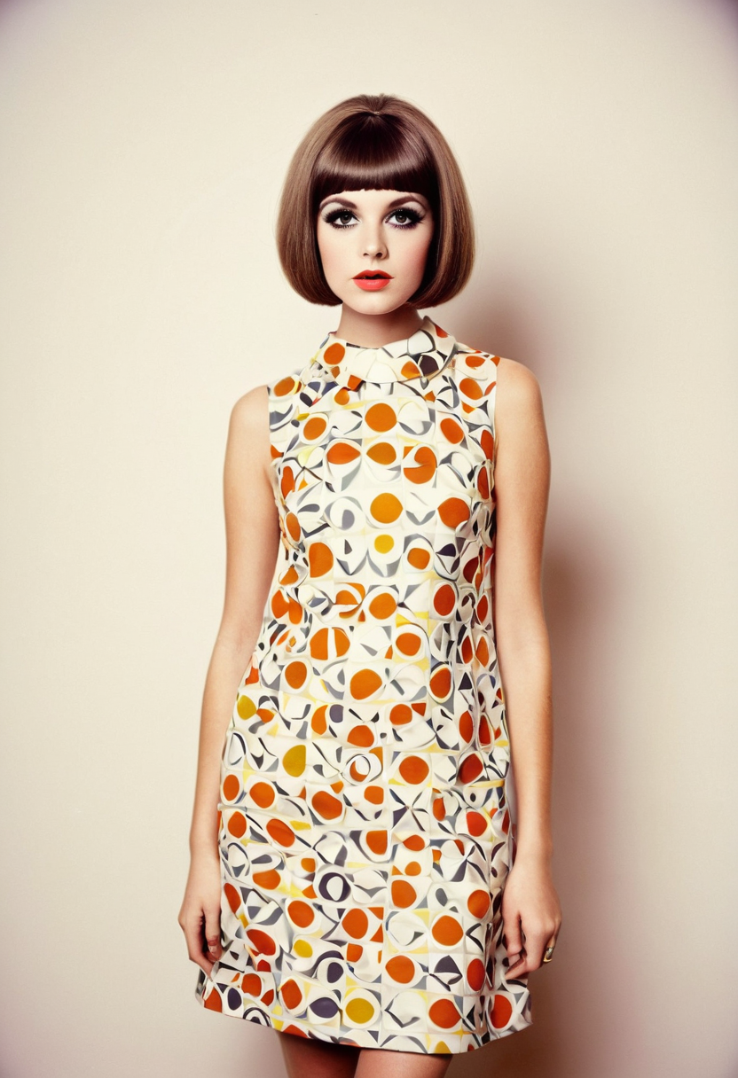 raw photo, full body photo,beautiful girl, 25 y.o. , youth subculture of the 60s, 1960s Mod Girl: With a Twiggy-inspired haircut and a bold, geometric dress, she channels the mod fashion of the swinging sixties. Her makeup is minimal yet striking, with exaggerated eyelashes and pale lips, grainy