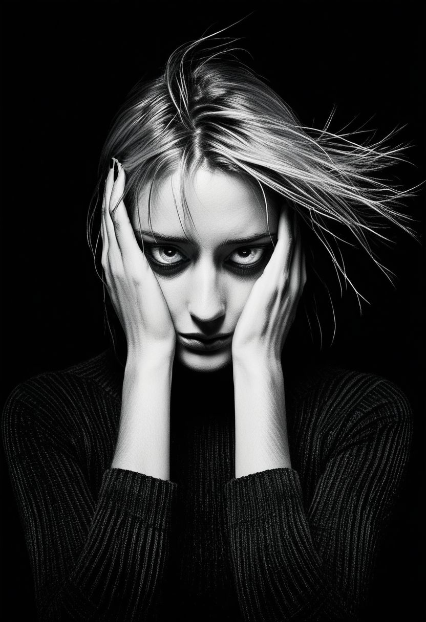 This modern art photograph is a profound exploration of human emotion, a visual poem that delves into the complex depths of sadness, loneliness, and regret. The subject, a young blonde girl with indigo eyes, becomes a vessel of raw emotion, his head bowed not only in physical but emotional weight. The black-and-red palette, enhanced by the graininess, adds a timeless quality, evoking a sense of nostalgia and melancholy. The slow shutter speed captures the hazy movements, a blur of his inner turmoil, while the double exposure with the upside-down symbolizes the fragility and beauty of life, a poignant contrast to his stoic expression. shot on Canon EOS 5D Mark III captures every nuanced detail, from the flawless hairs to the subtle gradient backdrop, creating a minimalist and tranquil setting that accentuates the subject's inner world. This image, a fusion of cinematic and conceptual art, plays with perception, inviting viewers to reflect on their own interpretations. It is a powerful portrayal of a man grappling with his thoughts, a moment of quiet despair, beautifully and hauntingly frozen in time, leaving a lasting impression of emotional depth and vulnerability.