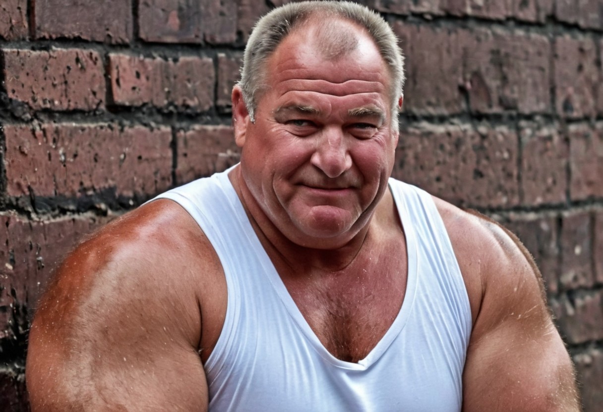 heavy metal music, alternative rock music, trucker, biker, daddybear, gay bear, ((romantic flirty expression, intimate, cinematic hazey atmosphere, arthouse movie, dark, nighttime, night, dark shadows, photograph, romantic movie scene)), old mature chubby obese german strongman man, old bavarian musclechub daddy, tanned skin, sweaty skin, sweating, oily skin, extremely hairy, hairy chest, hairy arms, hairy shoulders, doublechin, fat arms, big arms, gigantic biceps, hairy armpits, huge belly, gigantic chest, handsome chubby old face, loving expression, flirty smirk, white latex undershirt muslceshirt tanktop, golden jewellery, chunky golden rings, gold earring, in a dark gym workout at night, nighttime, dim, janitor, hobo, construction worker, trucker, brute, wise, barbarian, berserker, leader, boss, ((flexing his massive biceps, tanned old german bodybuilder)), ((masculine manly chubby face, extremely intimate sensual expression, loving expression)), (((sensual sexy pose, leaning against a brickwall in a gym)))
