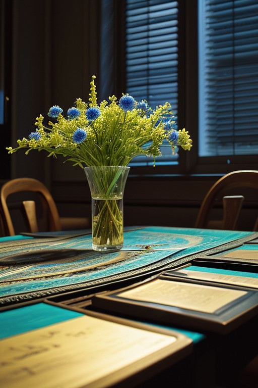 A red vaze with blue flowers on Round steel table and a window with golden blinds , luxury interior, at night , dim light, bokeh, nikon, cinematic